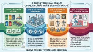 Lớp thứ ba là tiêu chuẩn sản phẩm đầu ra, áp dụng riêng cho từng nhóm hàng hóa như giấy tái chế, nhựa tái sinh, compost, RDF/SRF, điện – hơi – nhiệt, tro đáy xử lý, vật liệu xây dựng từ tro xỉ và các sản phẩm phụ thu hồi. Đây là lớp tiêu chuẩn còn thiếu nhất trong hệ thống hiện nay của Việt Nam.